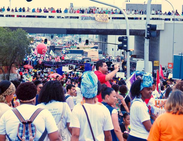 El momento fue simbólicamente poderoso en múltiples aspectos. A medida que millares de mujeres marchábamos hacia el Congreso Nacional —la sede del poder político formal en el Brasil— cantando consignas de resistencia (“Yo no acepto mi lugar en la cocina”, “Quiero estar en la revolución”), era imposible que la gente no nos viera o no nos escuchara. Llenamos las principales carreteras y caminos aledaños, forzamos al tráfico a detenerse hasta el punto en que las personas que se dirigían a trabajar o almorzar, en sus automóviles o en bus o a pie, se vieron obligadas a esperar mientras la marcha avanzaba poco a poco. En cierto momento no podías ver las calles debido a toda la gente que las saturó.