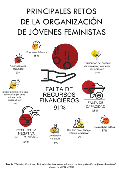 Otro desafío importante es que los recursos disponibles siguen sin llegar a sus iniciativas de base. a mayor atención a las cuestiones de igualdad de género, que incluye un objetivo independiente dedicado a la igualdad de género en los Objetivos de Desarrollo Sostenible (ODS) de la ONU, aún no se ha traducido en los recursos económicos críticos necesarios para que lxs jóvenes feministas se organicen. El ingreso promedio para los grupos feministas jóvenes en 2014 fue de $5,000 por año; por lo menos un cuarto de los grupos trabajan con menos de $500 al año.