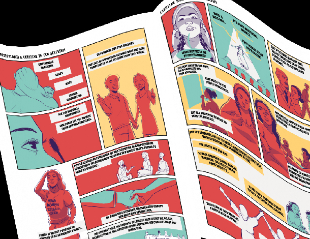Este cómic, creado por Dee Mathieu Cassendo* en colaboración con el equipo Activismo Joven Feminista de la AWID, representa visualmente las muchas tácticas creativas que lxs jóvenes organizadorxs feministas utilizan en su trabajo en diferentes contextos y movimientos, a pesar de no contar con los recursos suficientes y ser a menudo dirigido por voluntarixs.