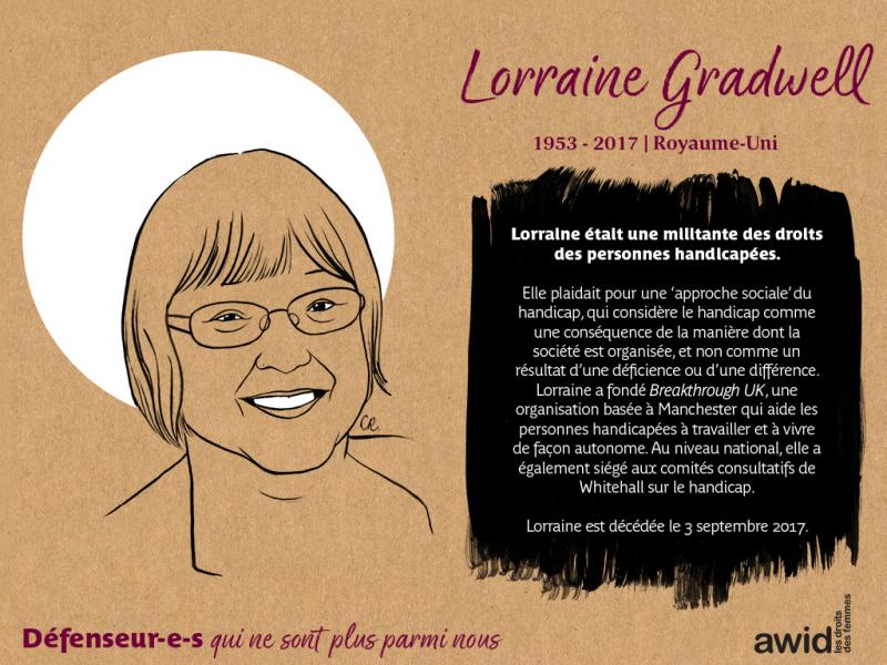 Et qu’en est-il de Lorraine Gradwell, qui a transformé le paysage des droits des personnes en situation de handicap au R.-U., de l’introduction des premiers taxis noirs accessibles de Manchester et des versements directs aux personnes en situation de handicap leur permettant de vivre en toute indépendance, à la création de la coalition de la Greater Manchester Coalition of Disabled People and Breakthrough UK, une organisation de soutien aux personnes en situation de handicap pour qu’elles vivent et travaillent en toute indépendance. Est-ce que l’histoire de son incessante mobilisation en faveur du modèle social du handicap – qui envisage le handicap comme la conséquence de la manière dont la société est organisée, plutôt que comme le résultat d’une déficience ou d’une différence – pourrait radicalement changer la manière dont les communautés en quête de justice dans d’autres contextes s’organisent ?