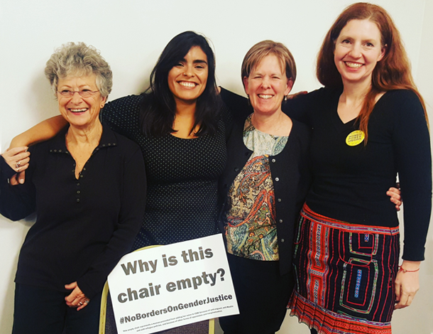 D'autres institutions féministes et de droits humains ont invoqué la responsabilité du pays d'accueil de la CSW. Lors de l’événement, une coalition d'organisations telles MADRE, Just Associates, Outright Action International, le Women Migration Network (réseau femmes en migration), le Centre for women’s global leadership (centre pour le leadership mondial des femmes) et l'Association pour les droits des femmes dans le développement (AWID), a lancé une campagne « No Borders on gender justice » (pas de frontières pour la justice de genre) appelant à « mettre fin aux politiques autoritaristes et xénophobes ». Lors des événements programmés par ces organisations, celles-ci ont mis en évidence l'absence d’activistes de droits des femmes qui font l’objet de menaces de la part de ces gouvernements, en plaçant symboliquement un siège vide à la table avec une pancarte indiquant : « Why is this chair empty » (« Pourquoi cette chaise est-elle vide ? »).