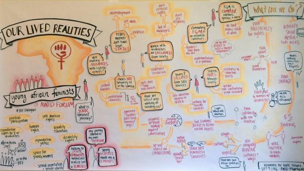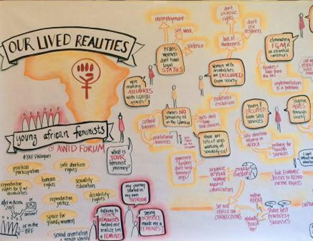 de faire part de mes observations sur la solidarité dont ont fait preuve les participant-e-s tout au long du Forum de l’AWID et du BFF. Dans aucun autre rassemblement féministe je n’avais fait l’expérience d’une solidarité aussi forte que celle qu’ont manifesté les féministes présent-e-s durant ces sept jours. Cette solidarité m’a donné le sentiment de détenir un véritable pouvoir en tant que féministe ! Elle m’a permis d’avoir suffisamment confiance en moi pour participer activement aux sessions auxquelles j’ai assisté et pour faire part de la réalité que je vis dans mon pays aux participant-e-s à notre session « Nos réalités vécues : voix de jeunes féminismes africaines ». Mais, plus encore, j’ai eu suffisamment confiance en moi pour redire haut et fort : « Je suis une féministe ! ». Nous devrions davantage pratiquer la solidarité dans nos différentes communautés. Si les personnes et les organisations qui œuvrent en faveur des mêmes objectifs font preuve de solidarité les unes envers les autres, l’opinion publique ciblée prendra conscience du fait qu’il ne s’agit pas de revendications d’ordre individuel mais d’une problématique collective qui ne devrait pas être négligée. Nous bénéficierions dès lors du pouvoir, de l’influence et de la résistance qui nous permettraient d’atteindre nos objectifs.