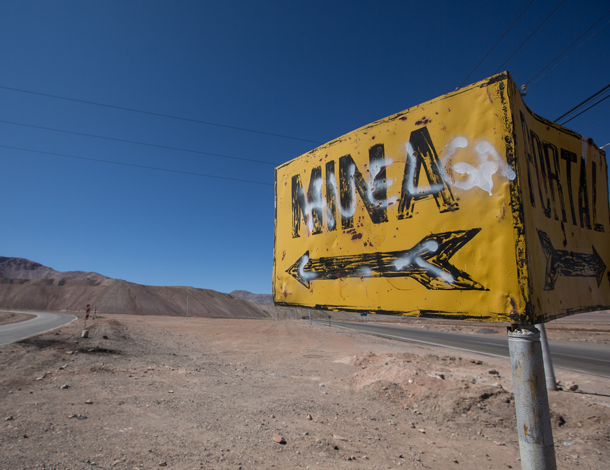 Le panneau affiche « Mine » avec l'inscription « Grève » taggée par dessus
