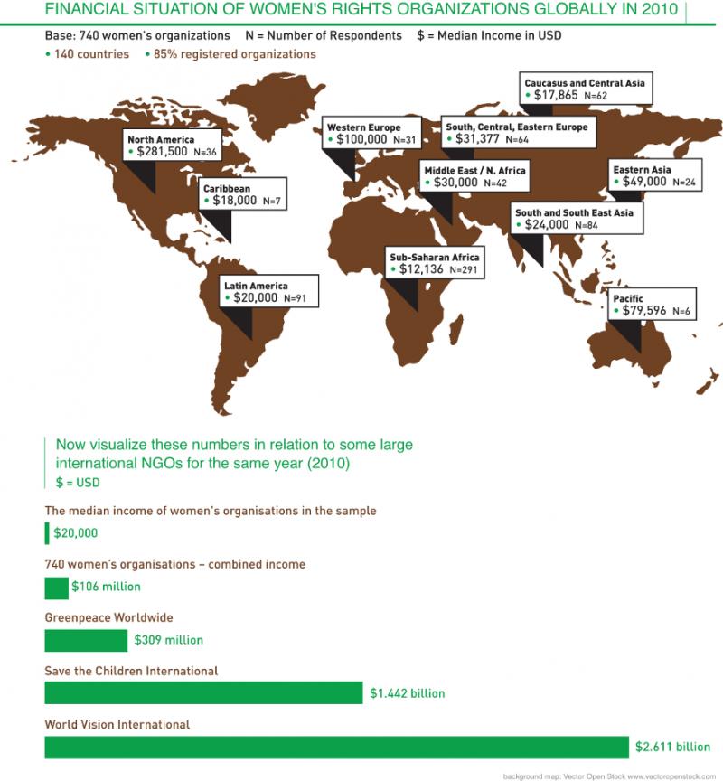 In 2008, the financial recession in the North and attendant global systemic crisis severely hit the already under-funded women’s rights movement. Budgets allocated for overseas development assistance were slashed in many cases, and conservative voices in Northern governments argued for the severe reduction of funding for international development. Significant cuts in funding for women’s rights were also made in other funding sectors, including foundations, women’s funds, INGOs and individual philanthropists. In 2010, AWID conducted a global survey of women’s organizations in five languages with over 1,100 responses from 140 countries. 740 organizations that took part in the survey provided budgetary information. The results showed that the combined income of these organizations for 2010 was close to US$106 million. In the same year, the income for Save the Children International and World Vision International was US$1.442 billion and US$2.611 billion respectively. However funding limitations for women’s rights organizations meant that organizations remained small, with many programmes being cut combined with the attendant staff losses. Women’s rights organizations consistently reported receiving funding for specific projects rather than long term flexible funding. 48% of the organizations that AWID polled in 2011 had never received core funding (invaluable funding needed for the administration of an organization), and 52% had never benefited from multi-year funding (that ensures the sustainable and uninterrupted strategic work of organizations). Women’s rights organizations responded to the crisis in funding by seeking to become more self-reliant through a variety of income generation activities such as membership fees.