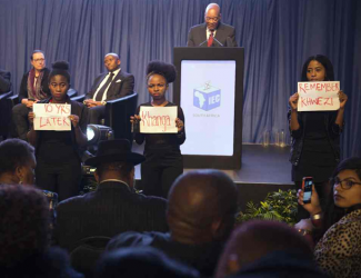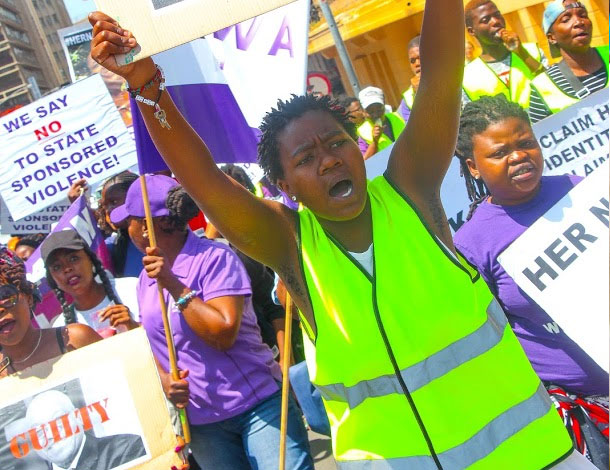 Their violet T-shirts match the jacarandas – in full spring bloom – as the protesters make their way through downtown Johannesburg in remembrance of Fezekile ‘Khwezi’ Ntsukela Kuzwayo who bravely brought forward a charge of rape in 2005 against Jacob Zuma (who became the South African President in 2009), and died towards the end of last year aged 41.