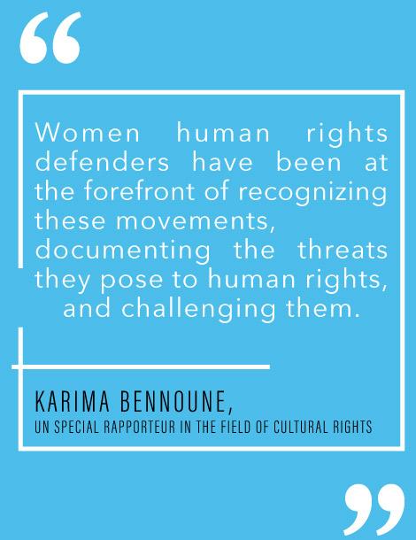 • Defence of the universality of rights, and critique of cultural relativism is vital to respond to the trends we are witnessing. We must reclaim culture and cultural rights, and fight for women’s rights to equally access, participate in, and define culture.