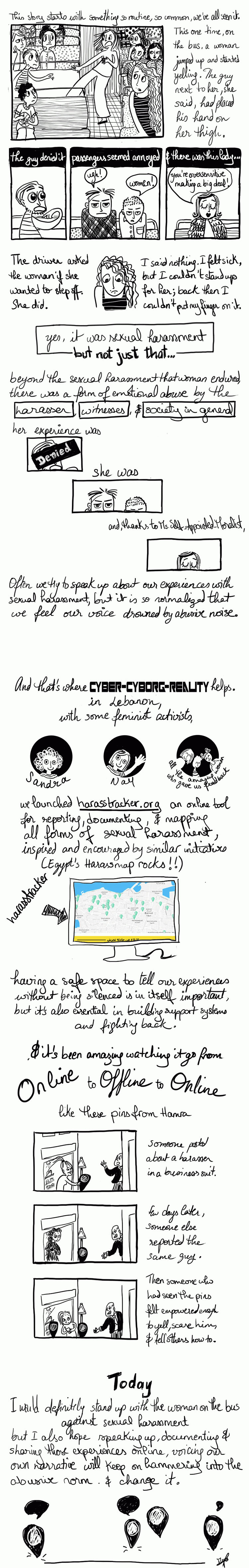 Myra is an award-winning illustrator, visual artist, co-founder of harasstracker.org, co-founder of Space27 (a feminist art space/work studio in Beirut) and a PHD candidate in Gender Studies (at Paris8) and obviously a fan of Alison Bechdel.