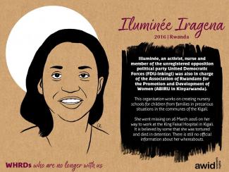Illuminée Iragena 20 November 2020 Read in: English French Spanish Category Civil & Political Rights Region Sub Sahara Africa Date of death / disappearance 2016 Cause of death / disappearance Disappeared / Desaparecida / Disparue